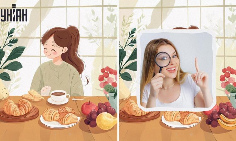 Billederne viser en sød pige, der nyder morgenmaden i sit køkken. Hun drikker kaffe (eller te) med lækre croissanter. Og til dessert forventes hun at få fruiti. Billederne ser næsten identiske ud, men der er fire små forskelle mellem dem. Vil du være i stand til at finde dem?