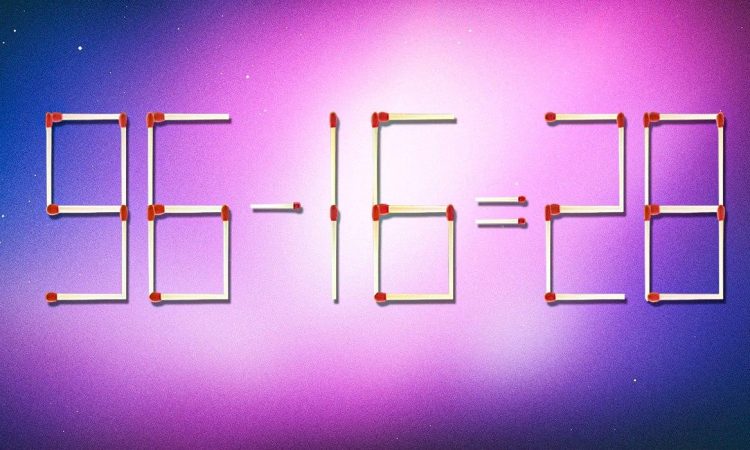 Nedenfor kan du se billedet, hvor tændstikkerne er lagt ud med ligheden 96-16=28. Men det er indlysende, at der fra et matematisk synspunkt er noget galt.