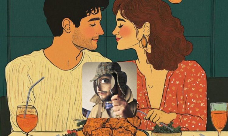 Foran dig står en forelsket mand og kvinde og snakker hyggeligt sammen under en romantisk middag. Pigen er klædt i en elegant kjole, og manden i en let trøje. På bordet står glas med drikkevarer og flere lækre retter. Der hænger malerier på væggene i etablissementet, og der hænger lyspærer ned fra loftet.