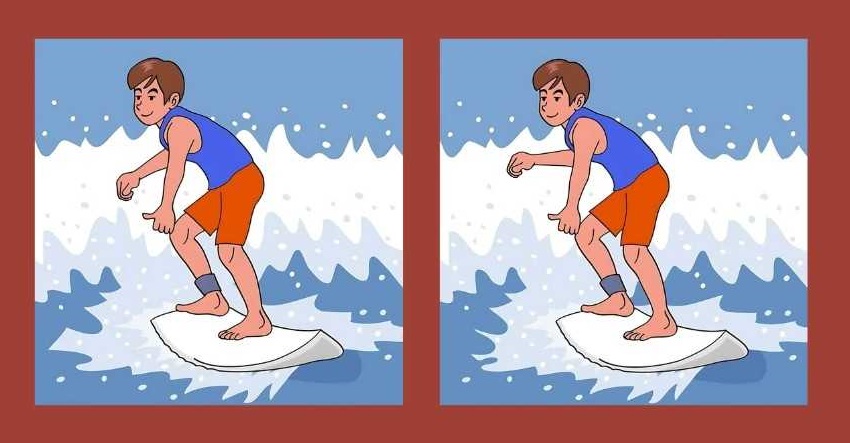 På billedet ser vi en surferfyr, der erobrer bølgerne på et surfbræt. Ved første øjekast kan det se ud, som om fyrene på begge billeder er ens, men hvis man ser nærmere efter, bliver det klart, at det ikke er tilfældet – et eller andet sted er der et par forskelle, som gør billederne forskellige.