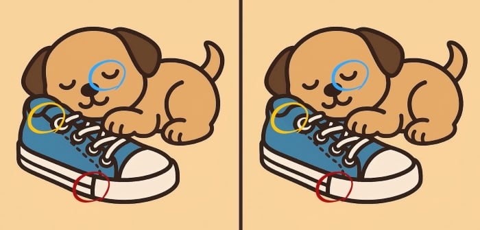 Så er du klar til den næste udfordring? Se nøje på de to billeder af en hvalp, der sover på en sko. De ser måske ens ud ved første øjekast, men der er 3 små forskelle. Tror du, at du kan finde dem alle på 51 sekunder? Prøv det, og test din synsstyrke!