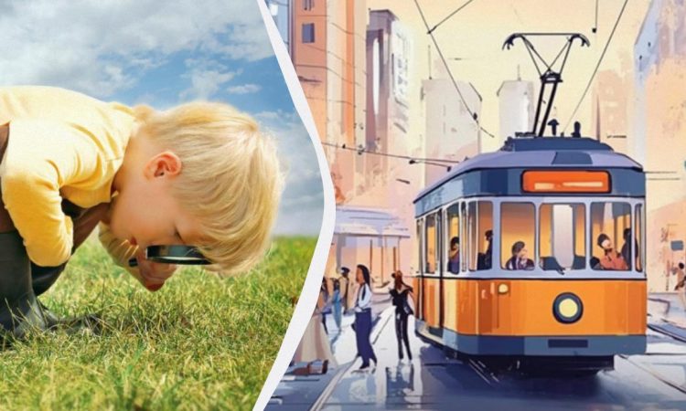 Billedet viser en travl gade med mennesker, der går langs den, og en almindelig sporvogn, der kører. Du skal sætte en timer til fem sekunder og nå at finde fejlen, inden tiden løber ud. Er du klar?