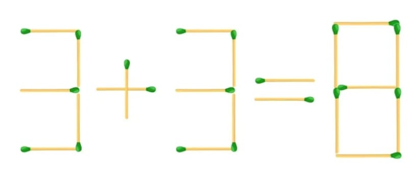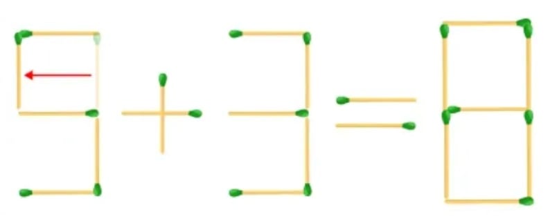 Hemmeligheden er at ændre tallenes form: Flyt bare en tændstik, så en af “treerne” bliver til en “femmer”. Derefter bliver eksemplet helt korrekt – 5+3=8.